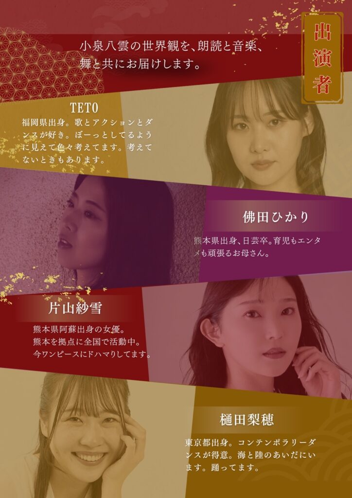 小泉八雲が熊本で記した怪談を、朗読・舞・歌で綴ります。